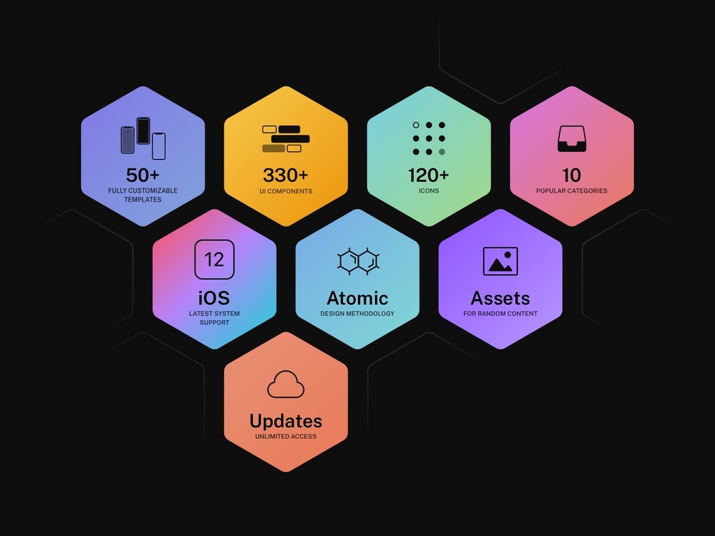 It consists of 50+ templates covering 10 different topics for most of the cases that mobile apps have.
