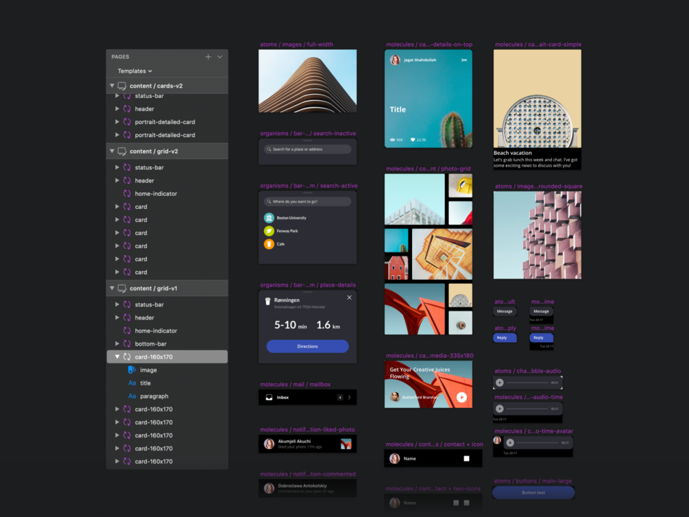 Each template consists of components based on the atomic design concept. So you can change everything from small details like icons and colors to complex components like cards and navigation. You can change it all and build your app in days.